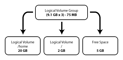 The logical volume group is divided into logical volumes, which are assigned mount points such as /home and / and file system types such as ext3. When "partitions" reach their full capacity, free space from the logical volume group can be added to the logical volume to increase the size of the partition. When a new hard drive is added to the system, it can be added to the logical volume group, and the logical volumes that are the partitions can be expanded.