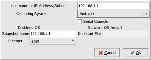 After completing the steps in Section 15.4 Finish Configuring the Diskless Environment, a window appears to allow hosts to be added for the diskless environment. Click the New button. In the dialog shown in Figure 15-1, provide the following information: