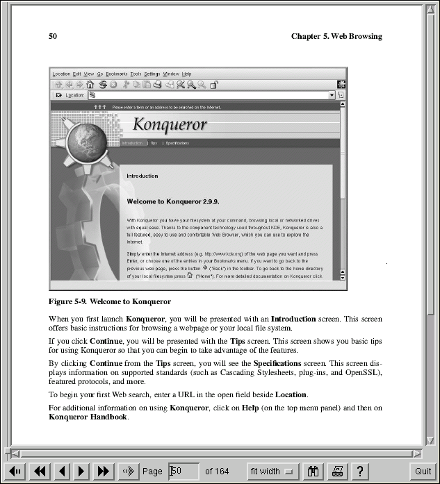 An open source application called xpdf is included with Red Hat Enterprise Linux. The xpdf toolbar at the bottom has navigational tools that let you move backward and forward through the PDF document, as well as standard zoom, print, and find tools. The xpdf man page provides useful information on the xpdf options. To view the xpdf man page, at a shell prompt type man xpdf.