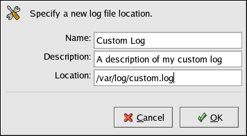 Provide a name, description, and the location of the log file to add. After clicking OK, the file is immediately added to the viewing area, if the file exists.