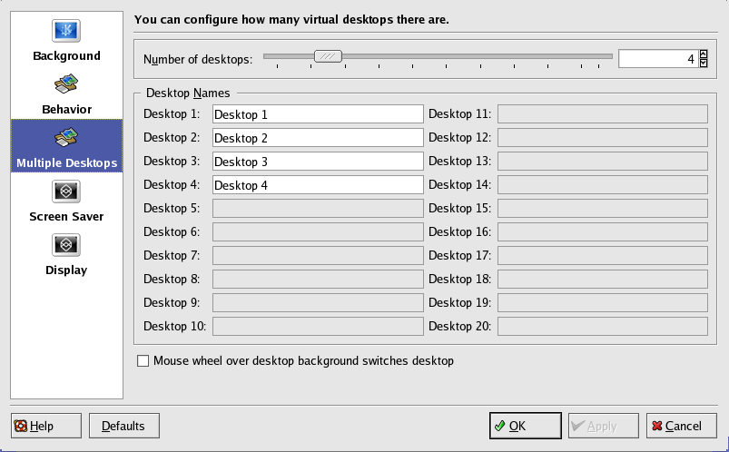 Click on the Multiple Desktops icon. Select the number of desktops available to you, then enter names for the desktops in the text fields. To save your changes, click the Apply button. To exit, click the OK button.