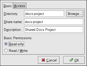 Basic Permissions — Whether users should only be able to read the files in the shared directory or whether they should be able to read and write to the shared directory.